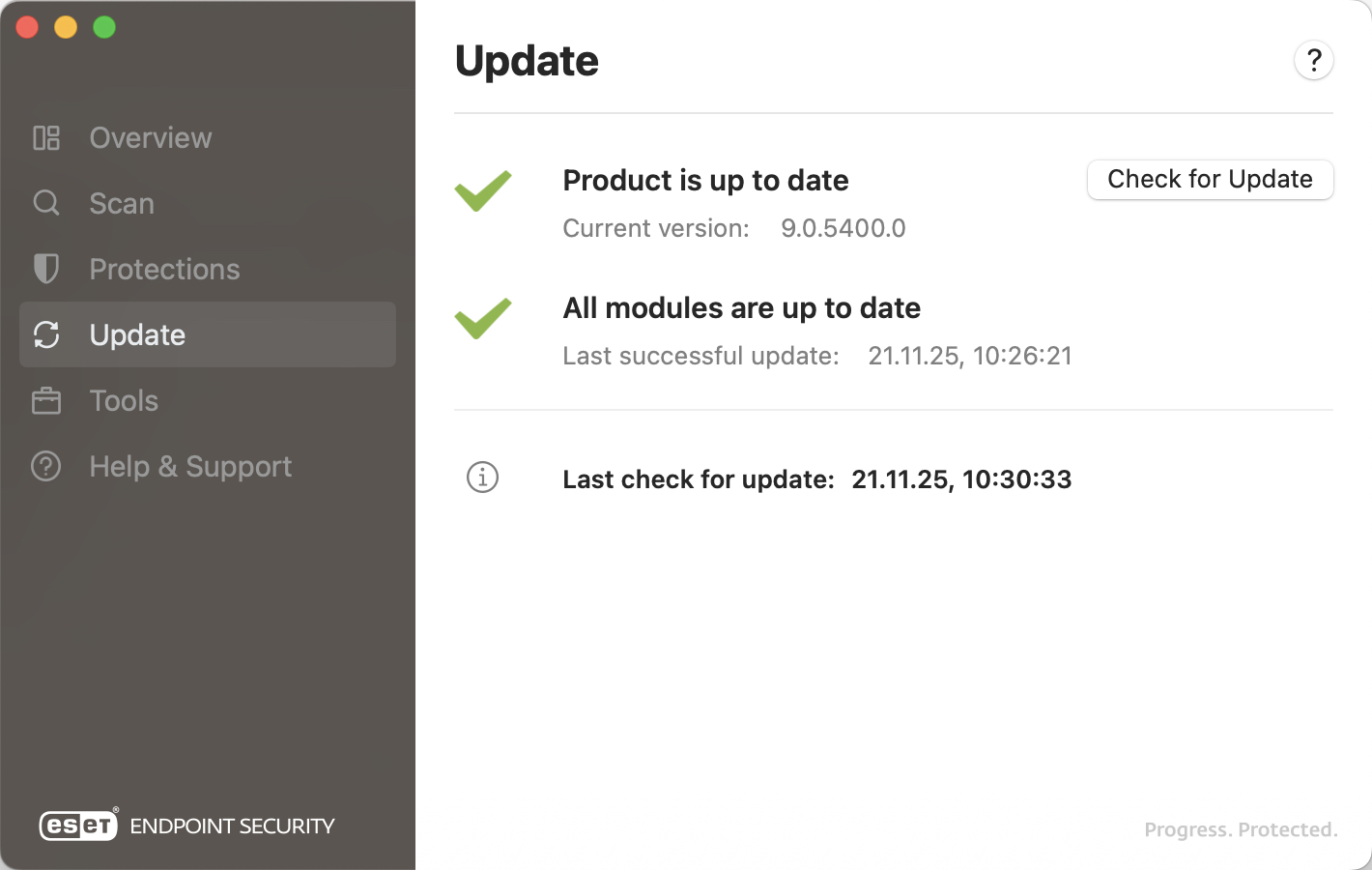 - By default ESET checks every hour for new updates and is updated at least once a day with new detection engine and module updates.