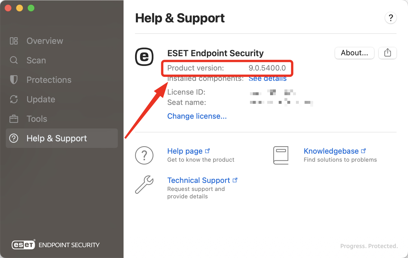 | Help & Support | Provides details about the license, access to help pages, ESET KB and Technical Support. |